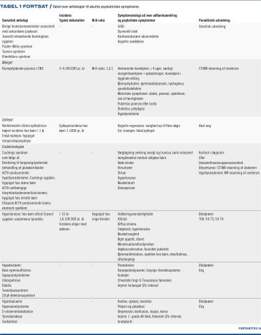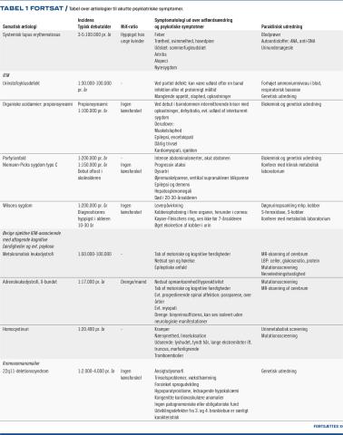 Somatiske sygdomme kan debutere med akutte psykosesymptomer opstået inden for timer til dage, såsom hallucinationer, vrangforestillinger, tankeforstyrrelser, psykomotoriske ændringer og andre psykiske symptomer, såsom de affektive og obsessive/kompulsive symptomer eller angstsymptomer. Diagnosen kan dog være udfordrende at stille, da flere af de organiske ætiologier er relativt sjældne. Blandt børn og unge er der rapporteret om over 60 forskellige kongenitte og erhvervede organiske årsager til psykoser, herunder infektioner, autoimmunitet, forgiftninger, strukturelle cerebrale forandringer, epilepsi og metaboliske tilstande (Tabel 1) [1, 2]. Sideløbende med symptomatisk behandling er en ætiologisk udredning vigtig, da tidlig behandling kan være afgørende for prognosen. I litteraturen er der foreslået diverse algoritmer med systematisk tilgang til diagnosticering, men der mangler fortsat konsensus om én fælles algoritme/kliniske red flags til identifikation af de børn, der skal undersøges grundigere og specifikt. Særligt hos børn, der ikke har somatiske symptomer, og hvor man ikke har gjort kliniske fund, kan det være udfordrende at adskille de organiske fra de ikkeorganiske psykiske lidelser.