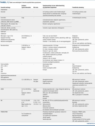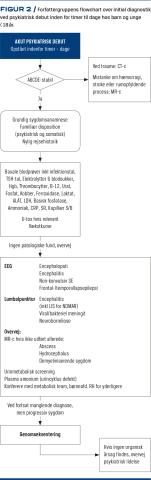 Ved akutte psykotiske symptomer, der er udviklet over timer til dage, kan flowchartet (Figur 2), der er udfærdiget af forfattergruppen, være vejledende for den initiale udredning. En grundig anamnese er essentiel og skal indeholde tidligere sygdomme af neurologisk og endokrinologisk art. Initialt bør der undersøges for intoksikation (rusmidler og medicin) samt infektion i centralnervesystemet (CNS), såsom meningitis og encefalitis. I denne artikel gennemgås de hyppigste og sjældnere årsager til akutte psykiatriske symptomer med organisk ætiologi (Tabel 1).