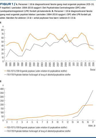 I ICD-10 registreres de organiske psykiatriske tilstande i det psykiatriske kapitel F under F00-F09 (organiske psykiske lidelser) og F10-19 (psykiske lidelser og adfærdsmæssige forstyrrelser forårsaget af brug af alkohol og andre psykoaktive stoffer) (Tabel 2). Organiske psykiatriske tilstande kan i visse tilfælde også registreres under de somatiske kapitler (f.eks. følger af en viral hjernebetændelse B941). I en nyligt foretaget opgørelse over de organiske F-diagnoser fra Det Psykiatriske Centralregister og Landspatientregisteret i perioden 1994-2016 ses det, at antallet af børn og unge, der er under 18 år og diagnosticeres med organiske psykiske lidelser i Danmark, fluktuerer, men generelt ligger antallet på 25-72 tilfælde pr. år (Figur 1 A). Figur 1B viser, at antallet af organiske psykiske lidelser uden relation til psykoaktive stoffer ligger relativt stabilt hos børn i alderen 0-13 år, hvorefter det stiger brat til et firedobbelt niveau. Psykiske lidelser i relation til psykoaktive stoffer sætter ind fra 13-årsalderen i takt med et stigende rusmiddelbrug og stiger kraftigt med en syvdobling ved 17-årsalderen.