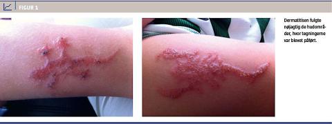 Efter første påførelse af tegningen havde der ikke været reaktion af nogen art i huden. Efter gentagen påførelse af tegningerne på samme hudområde ca. en uge senere, udvikledes der inden for to døgn kraftig erytematøs vesikopapuløst eksem i området. Dermatitisen fulgte nøjagtig det hudområde, hvor tegningen var blevet påført (Figur 1).