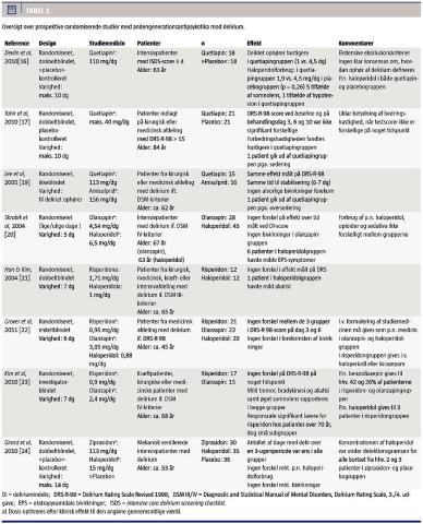 For quetiapin foreligger der et randomiseret, blindet, placebokontrolleret studie med patienter, der havde delirium og var indlagt på intensivafdelinger [16]. Studiet havde omfattende eksklusionskriterier og inkluderede 36 ud af 258 screenede patienter. Effekten af stigende doser af quetiapin i maks. ti dage eller til deliriets ophør evalueredes i forhold til placebo. I.v. haloperidol var tilladt som p.n. medicin i begge grupper, og den samlede indgivne mængde af haloperidol var ens i de to grupper. Man fandt, at de patienter, der fik quetiapin, havde en signifikant kortere tid til ophør af deliriet, som var studiets primære endepunkt. Forfatterne pointerer dog, at der ikke er konsensus om en definition af ophør af delirium. Der var ikke signifikant forskel på varigheden af indlæggelsestiden, men en tendens til, at patienter i quetiapingruppen blev udskrevet til hjemmet eller rehabilitering frem for anden hospitalsafdeling [16]. Der var flere tilfælde af somnolens og hypotension i quetiapingruppen, men ingen ekstrapyramidale bivirkninger. Antallet af patienter med QTc-forlængelse steg fra baseline i både placebo- og quetiapingruppen [16]. Den samtidige behandling med haloperidol