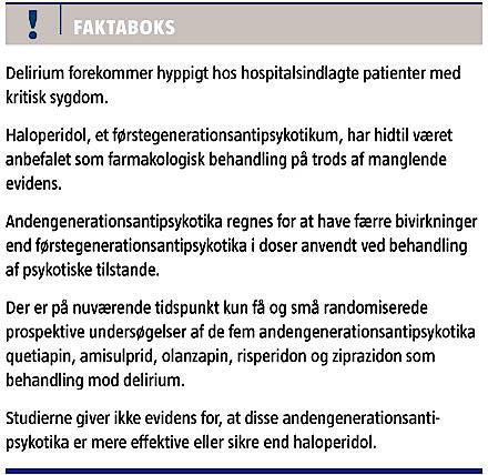 I tillæg til nonfarmakologisk behandling, som beskrevet andetsteds [8], har haloperidol, et førstegenerationsantipsykotikum (AP), traditionelt været anbefalet som farmakologisk behandling af delirium hos kritiske syge [2], hvor formålet er at dæmpe konfusion og agitation for at optimere behandlingen af den underliggende sygdom. Haloperidol anbefales i de nyeste guidelines fra American College of Critical Care Medicine dog ikke længere [2] pga. utilstræk-kelig evidens [3]. Behandling med haloperidol indebærer en risiko for bl.a. antikolinerge og ekstrapyramidale bivirkninger samt QTc-forlængelse [9]. Ved behandling af psykotiske tilstande menes ekstrapyramidale bivirkninger at forekomme mindre hyppigt ved brug af andengenerations-AP [10]. Dette udgør et rationale for også at anvende andengenerations-AP ved delirium. Generelt anvender man ved delirium antipsykotika i kortere tid og i lavere dosering end ved behandling af psykotiske tilstande.
