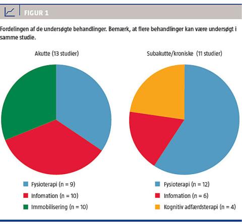 tionstypen randomized controlled trial. Desuden blev der inkluderet relevante referencer fra oversigtsstudier. Fokus har været på konservativ behandling, herunder specielt den behandling, der varetages af praktiserende læger og fysioterapeuter. Den initiale undersøgelse og rådgivning på skadestuen og en eventuel senere social rehabilitering er kun i begrænset omfang omfattet af artiklen. Den medicinske behandling adskiller sig ikke væsentlig fra anden smertebehandling og er ikke omtalt.