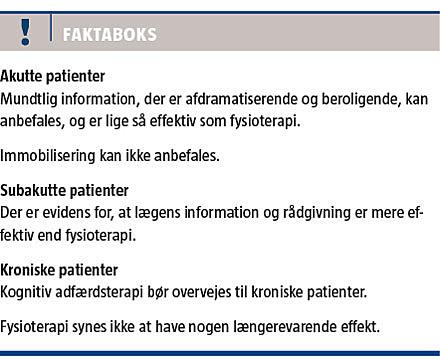 kliniske undersøgelser giver anledning til følgende konklusioner angående behandling: Immobilisering kan fortsat ikke anbefales til akutte patienter, og der er ikke påvist en effekt af fysioterapeutisk behandling sammenlignet med råd om at genoptage normal aktivitet. Hos de subakutte patienter fandtes en bedre effekt af træning superviseret af fysioterapeut end af information fra fysioterapeuter, men ikke bedre end vejledning fra læger. Der var ingen vedvarende effekt af fysioterapi hos de kroniske patienter, men kognitiv adfærdsterapi viser potentiale og bør overvejes.