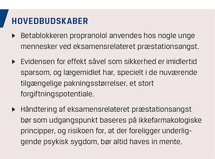 Propranolol is often prescribed to younger people with exam-related performance anxiety. Evidence for effect as well as safety is, however, sparse for this non-approved indication. Furthermore, only relatively large pack sizes are available in Denmark. This may spur an unnecessary, permanent overuse and increase the risk of overdosing and poisoning. The aim of this review is to examine the evidence for the effect as well as safety of propranolol for exam-related performance anxiety and to discuss, whether the use of this drug for this unapproved indication is rational.