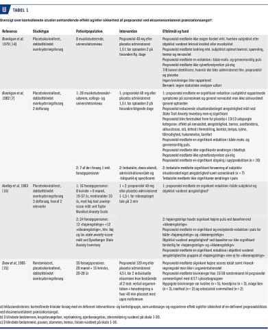 Ovenstående illustrerer, at anvendelsen af propranolol som symptomdæmpende behandling ved PA er relativt udbredt og velaccepteret, både nationalt og internationalt. Den videnskabelige evidens for effekt såvel som sikkerhed for denne ikkegodkendte indikation er imidlertid særdeles sparsom. Som det fremgår af Tabel 1 findes der meget få kontrollerede, blindede, kliniske studier, hvor man har undersøgt effekt og/eller sikkerhed af propranolol ved eksamensrelateret PA. Der er overordnet set tale om ældre, mangelfuldt rapporterede studier med en begrænset generaliserbarhed.