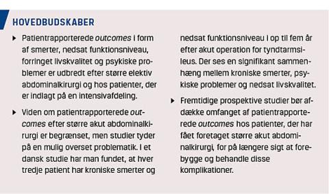 Akut abdominalkirurgi fylder meget på de kirurgiske afdelinger, men klinikerne har ofte et begrænset kendskab til patientrapporterede outcomes og deres betydning for patienternes livskvalitet og overlevelse efter større akutkirurgi. I et dansk studie med patienter, der var opereret akut for tyndtarmsileus, fandt man, at tre ud af fire patienter havde akutte smerter i det første postoperative døgn, og en ud af fire patienter havde kroniske smerter i op til fem år efter operationen [8]. En stor del af patienterne havde nedsat funktionsniveau (38%) i op til fem år efter operationen, og halvdelen af dem havde smerterelateret funktionsnedsættelse. Der er på nuværende tidspunkt ingen studier af depression og PTSD efter større akut abdominalkirurgi.