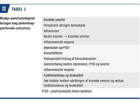 Patofysiologien og årsagssammenhængen bag patientrapporterede outcomes er ikke endeligt klarlagt (Tabel 1). Et review om postoperative forløb hos patienter, der var indlagt på intensivafdelinger, tydede på det kirurgisk inducerede inflammatoriske respons som en udløsende faktor for kognitiv dysfunktion, kroniske smerter og psykiske problemer [26]. Perioperativ højdosissteroidbehandling under abdominalkirurgi er påvist at være effektivt til forebyggelse af akutte postoperative smerter [27, 28]. Fremtidige studier må vise, om graden af inflammation og postoperativt stressniveau har sammenhæng med patientrapporterede outcomes, og om antiinflammatoriske perioperative interventioner vil have en effekt på de øvrige postoperative patientrapporterede outcomes.