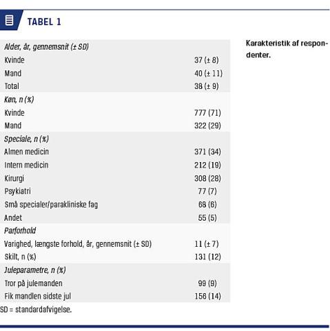 Lægernes (respondenternes) karakteristika og fordelingen på specialer er præsenteret i Tabel 1. Gennemsnitsalderen var 38 år, og mand/kvinde-ratioen var 0,4. Der var en ligelig kønsfordeling i forhold til juleparametrene (lige mange mænd (8%) og kvinder (9%) troede på julemanden og/eller fik mandlen sidste år (13% vs. 14%)).