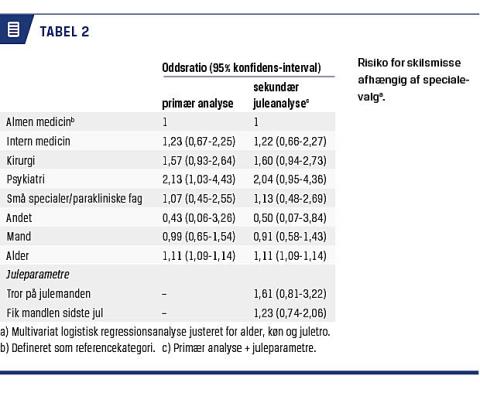 Troen på julemanden, og om man fik mandlen sidste jul, (Tabel 2) var associeret med en let øget risiko for at blive skilt, uden at dette dog var statistisk signifikant. Vi noterede dog, at for specialekategorien psykiatri nedsatte troen på højtidens mysterier risikoen for skilsmisse (OR: 2,04 (0,95-4,36)). Ingen af de psykiatere, som troede på julemanden, var blevet skilt i vores materiale.