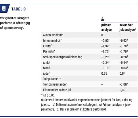 Varigheden af længste parforhold i forhold til valg af speciale, justeret for køn, alder og juletro indikerer, at almenmedicinere havde de længste parforhold af alle undersøgte grupper (Tabel 3). I den primære analyse sås, at internmedicinere med samme køn og alder som almenmedicinerne havde knap ét år kortere forhold, kirurger og psykiatere knap to år kortere. Subgruppeanalysen af anæstesilægers gennemsnitlige parforhold viste ligeledes signifikant kortere parforhold (næsten tre år) end almenmedicinere (–2,97 år;