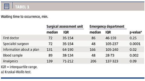 Studiet er baseret på 143 t.s observation i FAM og 155 t. i AKA. Studiet inkluderede 109 patienter. Der var ingen signifikant forskel i ventetid til læge, men ventetid til at blive undersøgt af speciallæge i kirurgi var 75 min længere i FAM end i AKA (p ≤ 0,0001), og ventetid til patientorientering om en udredningsplan var 50 min længere i FAM end i AKA (p = 0,002). Analgetika blev givet til 38% af patienterne i FAM mod 44% i AKA (p = 0,53). Blodprøver blev taget hos 96% af patienterne i FAM mod 74% i AKA (p = 0,001).