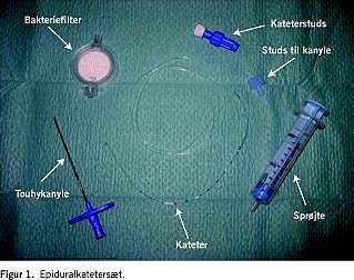 Som ovenfor fraset 5 ml-sprøjte, filterkanyle, spinalanæstetikum og spinalkanyle. Endvidere benyttes epiduralkatetersæt (Figur 1 ), epiduralanæstetikum og plaster/forbinding til fiksering af kateter.