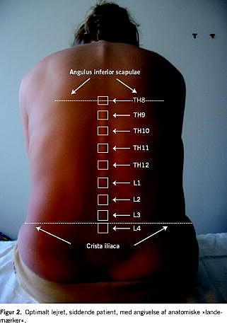 2) Det påtænkte indstikssted findes og markeres med tusch eller med en negl (Figur 2 ). Hvirvelmellemrum under L2 kan benyttes, idet medulla spinalis kaudalt når til L1-L2.