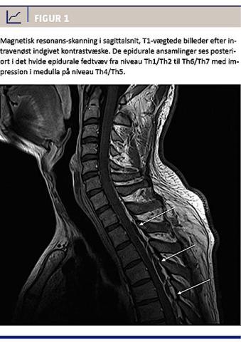 I løbet af det første indlæggelsesdøgn fik han urinretention. En akut MR-skanning viste epidurale ansamlinger posteriort fra Th1 til Th7 med impression i medulla på niveau Th4/Th5 (Figur 1). Fundet var foreneligt med spinale epidurale abscesser. I samråd med neurokirurgisk og mikrobiologisk afdeling fortsattes den antibiotiske behandling.