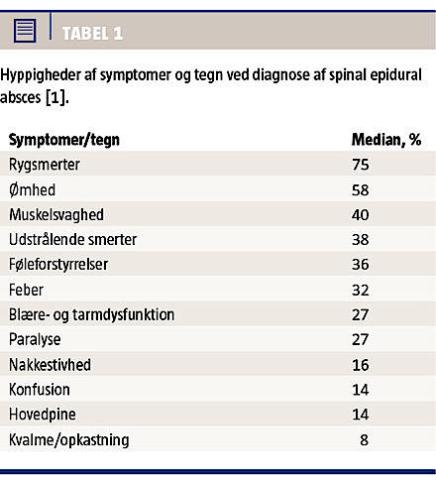 Spinal epidural absces er en sjælden infektiøs sygdom, som kan opstå via hæmatogen eller direkte spredning (fra spondylodiskitis) eller være iatrogen (f.eks. efter epidural anæstesi). Incidensen er 2,5-3 pr. 10.000 indlæggelser, og den er stigende [1]. Den lave incidens og de uspecifikke symptomer kan forsinke diagnosen [1], og 75% fejldiagnosticeres i første omgang [2]. Sen diagnose kan resultere i svære neurologiske følger [1, 3], og infektionen er fatal hos 2-20% [1-3].