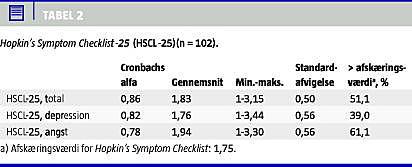 I Tabel 2 er det vist, hvorledes torturoverleverne på HCL-25 scorede relativt højt på delskalaer for angst sammenlignet med scoringer på delskalaer for depression. Standard afskæringsværdier på HSCL-25 viste en population, som var mindre medtaget af den organiserede vold end de grupper fra andre kulturer, som skalaen har været afprøvet på (51,1% med en samleet score over afskæringsværdien, 61,1% med scorer over afskæringsværdien på delskalaen for angst og 39,0% over afskæringsværdien på delskalaen for depression).