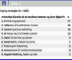 I fordelingen af kategorierne for coping-strategier, der blev udledt af den kvalitative undersøgelse af interviewudskrifterne, ses hvorledes tibetanernes politiske og buddhistiske engagement blev nævnt hyppigst (Tabel 3 ). Men også udførelsen af buddhistiske ritualer som afsigelse af bønner blev ofte omtalt. Nogle nævnte nødvendigheden af at have en generel spirituel indstilling, som f.eks. medfølelse med torturbødlerne og næstekærlighed til alle levende væsener. Andre omtalte nødvendigheden af at tvinge sig til at tænke positivt og af at være opmærksomt tilstedeværende (»to have a sharp mind «).