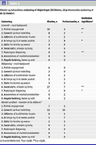 I den nederste del af Tabel 4 vises, hvorledes politisk engagement og en generel spirituel indstilling hyppigt blev omtalt i de åbne interview, hvor klienter og sundhedsarbejdere skulle definere mental sundhed; her var der ingen signifikante forskelle mellem grupperne