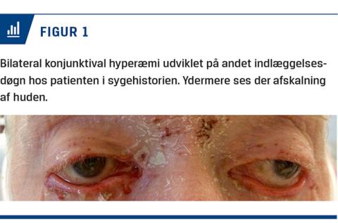 Et døgn efter indlæggelsen fik han et diffust højrødt erytem, primært på underekstremiteterne og thorax, samt svær bilateral konjunktival hyperæmi med purulens (Figur 1). På mistanke om TSS blev behandlingen omlagt til cefuroxim 750 mg × 3, clindamycin 600 mg × 3 med tillæg af intravenøst givet immunglobulin (IVIG) 90 g × 1 i tre dage. Mistanken blev underbygget af en podning fra transplantatet med vækst af S. aureus og produktion af Staphylococcus-TSS-toksin-1. Øvrige dyrkninger var uden vækst. CT af thorax og abdomen var upåfaldende.