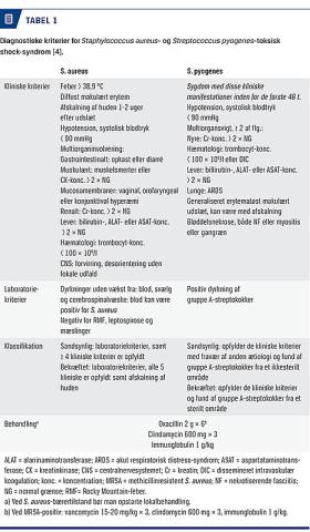 S. pyogenes-TSS og S. aureus-TSS hinanden meget. Udslættet ved S. pyogenes-TSS er af mere skarlatiniform type, og der kan forekomme vesikler, blister og bullae. S. pyogenes-TSS skyldes altid en invasiv infektion, og bloddyrkningerne er oftest positive. Diagnosen stilles via kliniske og mikrobiologiske kriterier, som det fremgår af Tabel 1 [4].