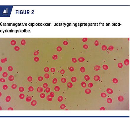 Næste dag var der vækst af gramnegative diplokokker i bloddyrkningerne (Figur 2), og identifikation viste, at det drejede sig om N. meningitidis. Patienten var nu upåvirket og afebril, men CRP- og leukocytniveauerne var steget til hhv. 208 mg/l og 16 × 109/l, og trombocytniveauet var faldet til 118 × 109/l. Inden følsomhedsbestemmelse blev antibiotikabehandlingen ændret til ceftriaxon og metronidazol. De påviste meningokokker var følsomme for penicillin, ceftriaxon og ciprofloxacin. Pus fra peritoneum var dyrkningsnegativ, men ved PCR påvistes der N. meningitidis. Ved et gynækologisk tilsyn og et øre-næse-hals-tilsyn fandt man intet abnormt. Efter en kortvarig anden febril episode, som man ikke fandt årsagen til, blev patienten udskrevet i velbefindende efter i alt 16 dages intravenøs antibiotisk behandling. Undersøgelse af meningokokisolatet på referencelaboratoriet på Statens Serum Institut viste, at det var SG-W cc11. Slægtskabsanalyse baseret på helgenomsekventering af alle danske SG-W cc11-isolater fra perioden januar 2016-oktober 2017 viste, at de var beslægtede, men at der med høj sandsynlighed ikke forelå direkte transmission mellem denne patient og nogen af de øvrige patienter.