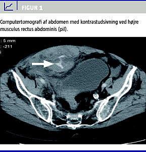 En 75-årig kvinde blev indlagt på grund af smerter i højre side af abdomen igennem to uger. Ved indlæggelsen var blodtrykket 100/75 mmHg, og pulsen var 87. Patient havde atrieflimren, hvorfor der var ordineret oral antikoagulationsbehandling (warfarin). INR var forhøjet til 3,9. Der var ingen traumer i anamnesen. Hæmoglobinkoncentrationen faldt fra 6,7 til 4,1 mmol/l under indlæggelsen. Der var primært mistanke om abdominal aortaaneurismeruptur, og der blev givet blodtransfusion samt frosset plasma og væsketilskud. En computertomografi (CT) af abdomen viste kontrastudsivning ved højre musculus rectus abdominis (Figur 1 ). Da patienten var fortsat hæmodynamisk ustabil trods blodtransfusion, besluttede man at udføre embolisering af det blødende kar umiddelbart efter CT. Der blev foretaget selektiv/superselektiv angiografi af højre a. epigastrica inferior, hvorved der blev påvist ekstravasation af kontrast. Derefter blev der udført embolisering af den blødende arteriegren med anvendelse af mikrokateter og flere 2 mm og 3 mm mikro- coils , hvorved den blødende arterie blev okkluderet. Lokal hæmostase i lysken var problemfri efter lukning af punkturen med StarClose (Abbott, USA). Derefter var patienten symptomfri med en gradvis hæmodynamisk stabilisering og ingen ny blødningsepisode.