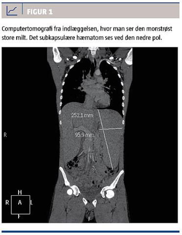 observation på infektionsmedicinsk afdeling, men blev efter kort tid overflyttet til intensivafdelingen i organkirurgisk regi på grund af en computertomografi (CT)-verificeret monstrøst forstørret milt (25 × 10 cm) med ledsagende subkapsulært hæmatom