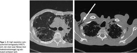 Under patientens indlæggelse i februar 2003 på et andet sygehus gav dyrkninger og undersøgelser for typisk bakteriel og atypisk pneumoni alle negativt resultat. Patienten blev udskrevet afebril. Forud for indlæggelsen i marts 2003 havde han haft et vægttab på ca. 15 kg. Der var hørlig krepitation basalt ved auskultation, trommestikfingre, men ingen hypermobilitet. C-reaktivt protein var på 12. Der var ikke påviselige præcipiterende antistoffer for undulat. En thoraxrøntgen viste udtalt fibrose, højresidig kappepneumothorax og subkutan emfysem. Et thoraxrøntgen fra februar 2003 viste lille venstresidig kappepneumothorax og svær fibrose. En high resolution computerized tomography (HRCT) af thorax (Figur 1 ) viste trakeobronkiomegali, fibrose (bikagetegning), bronkiektaser, emfysem og subkutant emfysem, men ingen sikre områder med matglastegning.