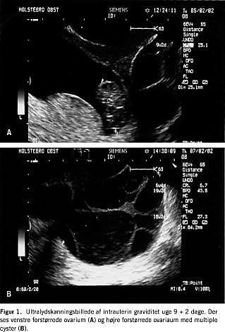 En 31-årig kvinde havde tidligere fået foretaget konisering på grund af svær dysplasi. Hun var gravid i første cyklus efter p-pille-seponering og sås første gang ambulant med førstetrimester blødning. En vaginal ultralydsskanning viste intrauterint beliggende gestationssæk med et fosteranlæg på 8,5 mm svarende til en gestationsalder på seks uger og seks dage. Begge ovarier blev fundet normale. Ved en ambulant kontrol to uger senere havde patienten kraftige subjektive graviditetssymptomer i form af kvalme og brystspænding. Paraklinisk fandtes kraftig forhøjet s-humant choriongonadotropin (hCG): 348.344 IE/l, steget fra 130.225 IE/l en uge tidligere. En vaginal ultralydskanning viste intrauterin gestationssæk med et fosteranlæg på 17 mm. Ved næste ambulante kontrol svarende til en gestationsalder på ni uger og to dage viste en vaginal ultralydsskanning et tydeligt fosteranlæg på 25 mm med hjerteaktion. Derudover sås ovarierne at være forstørrede til henholdsvis 7 cm og 10 cm i diameter med multiple store cyster, der fuldstændig lignede ovarielt hyperstimulation. Der var ingen fri væske i fossa Douglassi og ingen acsites (Figur 1 ). Patienten var alment upåvirket.