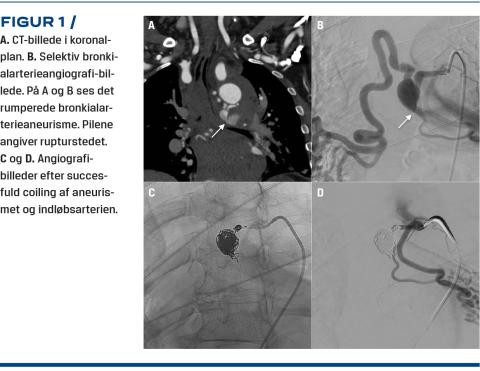 Den tentative diagnose var efter ankomsten fortsat AKS, men fordi patienten havde smerteudstråling til ryggen og hypotension, blev der foretaget akut CT-angiografi for at udelukke aortadissektion, inden man påbegyndte AK-behandling. CT-angiografien viste hæmomediastinum på usikker baggrund. Efter konference med den radiologisk vagthavende på både stamsygehuset og Rigshospitalet viste det sig, at der var tale om et rumperet BAA (18 mm i diameter) udgående fra højre bronkialarterie. Yderligere sås der et hæmatom langs aortas forløb (Figur 1). Patienten blev overflyttet til Rigshospitalet med akutlægeberedskab. Forud for dette blev blodtrykket stabiliseret alene på væskebehandling. På Rigshospitalet blev der udført bronkialarterieangiografi, som viste et BAA i højre bronkialarterie.