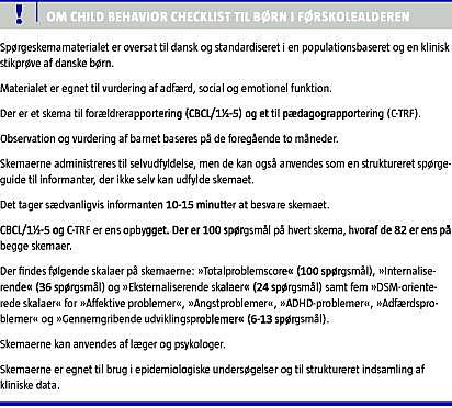 Summary Questionnaires on behaviour in preschool children Ugeskr Læger 2009;171(47):3445-3448 This article presents an American psychometric instrument; the Child Behavior Checklist for Ages 1-5 (CBCL/1-5) appropriate for application in the clinical setting and in research for assessment of behavioural, emotional and social problems in preschool children. Selected scores from a Danish population-based sample and a clinical sample on the CBCL/1-5 and the Caregiver Report Form (C-TRF) are presented. CBCL/1-5 and C-TRF seem reliable and valid for assessing psychopathological problems in preschool children from the perspectives of multiple informants in diverse settings.