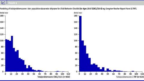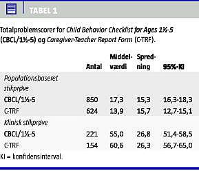 I den populationsbaserede stikprøve fandtes en gennemsnitlig TPS for forældrerapporteret adfærd på 17,3 (95%-konfidensinterval (KI); 16,3-18,3). Den tilsvarende score i den kliniske population var 55,0 (95%-KI; 51,4-58,5). Dermed scorede danske børn fra den populationsbaserede stikprøve signifikant lavere end tilsvarende børn fra USA, mens scorerne fra de kliniske populationer ikke var signifikant forskellige [2]. Der fandtes endvidere en tendens mod faldende TPS med stigende alder og en mod højere TPS for drenge end for piger, hvilket er analogt med resultaterne fra USA [2].