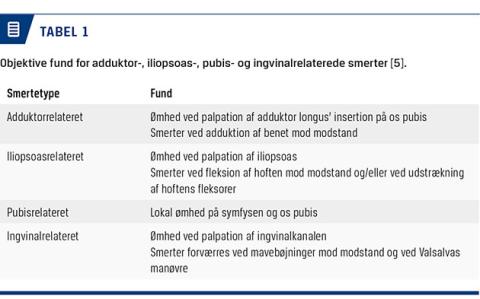 Som beskrevet er det specielt tre tilstande, der kan forveksles med ingvinalrelaterede smerter, og objektiv undersøgelse for alle fire tilstande præsenteres i Tabel 1. Ved ingvinalrelaterede smerter, som viser sig ved ømhed ved palpation af ingvinalkanalen, fremprovokeres der også smerte i abdominalmusklernes tilhæftning på os pubis ved mavebøjninger mod modstand. Valsalvas manøvre og hoste kan ligeledes fremprovokere smerte. Ved adduktorrelaterede smerter fremprovokerer adduktion af benet mod modstand smerte, og der vil være udtalt ømhed ved adduktorinsertionen. Ved iliopsoasrelaterede smerter vil der være ømhed ved palpation af m. iliopsoas og/eller iliopsoassenen, og ofte vil fleksion af hoften mod modstand og passiv udspænding af hoftefleksorerne fremprovokere smerte. Der er ikke specifikke test, der fremprovokerer smerte ved pubisrelaterede smerter, men der vil være lokal ømhed ved palpation af symfysen og os pubis [1].