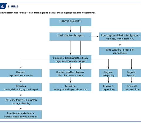Behandlingen rettes mod den eller de strukturer, der er årsag til smerterne. Adduktorrelaterede, iliopsoasrelaterede, pubisrelaterede og ingvinalrelaterede smerter behandles med aflastning fra den udløsende aktivitet og samtidig initiering af et målrettet træningsprogram, der har til formål at styrke primært den eller de skadede muskler og sener, men også generelt at træne den bækkenrelaterede muskulatur (hoftens rotatorer, m. gluteus maximus, m. gluteus medius, abdominal muskulatur, m. iliopsoas, tensor fascia latae, m. quadriceps femoris, m. quadratus lumborum og m. multifidi) [3]. Træningen fokuserer på at styrke musklerne isometrisk, koncentrisk og excentrisk. Ved ingvinalrelaterede smerter er det især abdominalmuskulaturen, der skal trænes, både m. rectus abdominis og mm. obliquus abdominis externus og internus og ikke mindst m. transversus abdominis. Efter seks uger må patienterne jogge, hvis det ikke fremprovokerer smerter. Når patienterne kan fuldføre træningen og jogge smertefrit, kan de gradvis vende tilbage til sport [3]. Hos en andel af patienterne forsvinder smerterne ikke med træningsbehandlingen, og man bør derfor efter 2-6 måneder uden behandlingseffekt overveje kirurgi [8, 17, 18] (Figur 2).