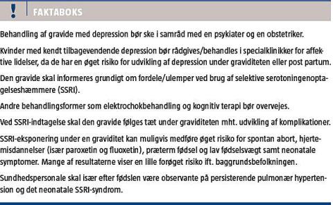 Behandling af gravide med depression er en kompleks opgave og bør baseres på den gravides tidligere sygehistorie og behandling samt vurdering af sværhedsgraden af depressionen og evt. selvmordsfare. Hvis behandling med AD overvejes, skal den baseres på viden om de risici, som SSRI kan have for