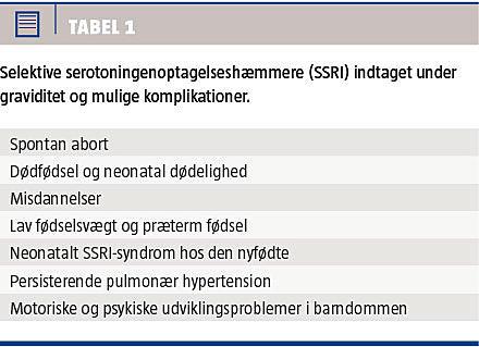 Forbruget af selektive serotoningenoptagelseshæmmere (SSRI) er steget i de seneste år, også blandt gravide kvinder. Op til 12,8% af de gravide kan have depression eller depressive symptomer [1], og ca. 3% af de gravide indtager antidepressiv medicin (AD) [2]. SSRI (fluoxetin, citalopram, paroxetin, sertralin, escitalopram) er det mest brugte AD blandt gravide. Gravide, der indtager AD, er oftest ældre, rygere og har lavere uddannelse og indkomst end gravide, der ikke indtager AD [3]. En ubehandlet depression under en graviditet kan medføre en livsstil, som i sig selv kan være skadelig for fostret, herunder dårlig ernæring, rygning, alkoholindtagelse [4] og i sjældne tilfælde suicidaladfærd [5]. På den anden side passerer SSRI placentabarrieren [6], og medfører dermed risiko for skadelig påvirkning af fostret.