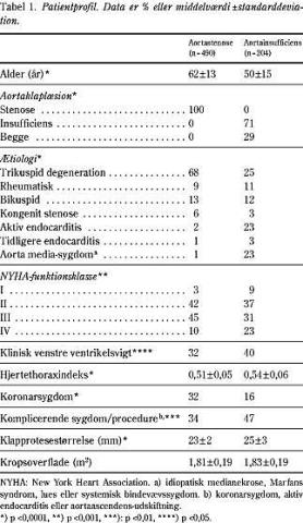 Patienternes præoperative profil er vist i Tabel 1 i relation til den dominerende aortaklaplæsion. Gruppen med aortastenose var ældre ( 70 år, 30% versus 8%, p<0,0001) og flere havde koronarsygdom end i insufficiensgruppen, der oftere havde endocarditis eller aorta media-sygdom. Klapproteserne inkluderede hele størrelsesspektret (19-31 mm); 27% i stenosegruppen havde en 19 mm eller 21 mm klap mod 18% i insufficiensgruppen (p <0,001). Den tidlige mortalitet (≤ 30 dage) var 5,5% hos 434 patienter med kronisk aortaklapsygdom, 6,6% hos 183 med associeret CAD, 7,3% hos 55 med aktiv endocarditis og 9,1% hos 22 med aortaascendens-udskiftning. De tidlige dødsfald (n=42) skyldtes hjertesvigt hos 45%, myokardieinfarkt hos 21%, arrytmi hos 5%, mulig klapproteserelateret hos 5% (cerebral emboli og cerebral blødning) og hos resten (24%) var dødsårsagerne hjerte- og klapurelaterede årsager.