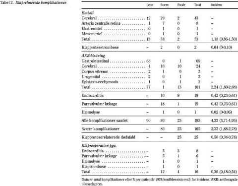 Opfølgningen var et led i en opdatering af Århus Aortaklap Databasen (4, 5, 7). Opfølgningen var 100% komplet og blev foretaget i løbet af 1998 med kontakt til de levende patienter, alle patienters praktiserende læger og alle sygehusafdelinger, hvor patienterne havde været indlagt: Toogfyrre patienter døde inden for 30 dage efter operationen, 190 døde senere og 462 var stadig i live. Dødsattester var tilgængelige for alle dødsfald og autopsirapporter for 25 (60%) af de tidlige og 52 (27%) af de sene dødsfald. Der blev akkumuleret i alt 4.502 patientår (middel 6,5 år, maks. 18,6 år). Registrering af klapproteserelaterede komplikationer fulgte internationale kriterier som tidligere beskrevet (5, 7, 9, 10). Embolier og blødningskomplikationer blev registreret som »lette«, hvis symptomerne svandt inden for 48 timer og som »svære« (eller fatale) hvis de ikke svandt inden for 48 timer.