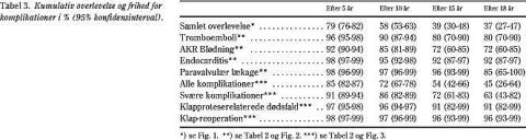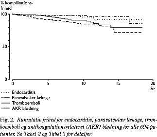 Resultater: Overlevelsen var 79%, 58%, 39% og 37% efter henholdsvis fem, ti, 15 og 18 år. Kun 12% af dødsfaldene (0,60%/patientår) var relateret til klappen med en 15-års kumulativ frihed på 91%. Embolier (1,18%/patientår) og antikoagulationsrelateret blødning (2,24%/ patientår) var de dominerende komplikationer med 15-års-friheder på henholdsvis 80% og 72%. Klaptrombose blev noteret hos to patienter (0,04%/patientår), der var ude af antikoagulationsbehandling. Der blev ikke observeret mekanisk svigt af protesen. Endocarditis (0,42%/patientår) havde en 15-års-frihed på 92% imod henholdsvis 72% og 54% for svære komplikationer (2,33%/patientår) og alle komplikationer samlet (4,33%/patientår) og 96% for klapreoperation (0,36%/ patientår). Patientalder og hjerterelaterede faktorer var risikofaktorer for mortalitet og proteserelaterede komplikationer.