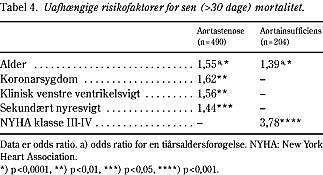 Materiale og metoder: Der blev udført en 100% komplet retrospektiv opfølgning på 694 voksne patienter, der fik foretaget aortaklapudskiftning med St. Jude-klappen i årene 1980-1993. Cox's regressionsanalyse blev brugt til at identificere uafhængige risikofaktorer.