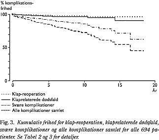 Komplikationerne er vist detaljeret i Tabel 2, Fig. 2 og Fig. 3 , mens Tabel 3 viser de kumulative friheder. Der var 53 emboliske hændelser hos 42 patienter; 75% var svære eller fatale. Incidensen ændrede sig ikke over tid. Der var to tilfælde af klapprotese trombose. Det ene indtraf 8,2 år efter operationen hos en 77-årig kvinde med svær universel arteriosklerose; hun fik ikke vitamin K-antagonistbehandling (men acetylsalicylsyre og dipyridamol). En af de to klapskiver fandtes immobiliseret i halvåben position; hun blev ikke reopereret pga. alder og demens, men var i live ved studiets afslutning, 1,1 år efter trombosen. Det andet tilfælde indtraf 5,9 år efter operationen hos en 49-årig kvinde. Hendes INR var under »målkorridoren« umiddelbart før klaptrombosetilfældet, og hun gennemgik en succesfuld klap-reudskiftning. Risikofaktorerne for tromboemboli inkluderede høj alder (OR 1,6 for en tiårsaldersstigning) og lav aortaklapgradient (OR 1,4 for gradientfald på 25 mmHg, fx fra 75 mmHg til 50 mmHg) i stenosegruppen og alder 70 år (OR 4,6) i insufficiensgruppen.