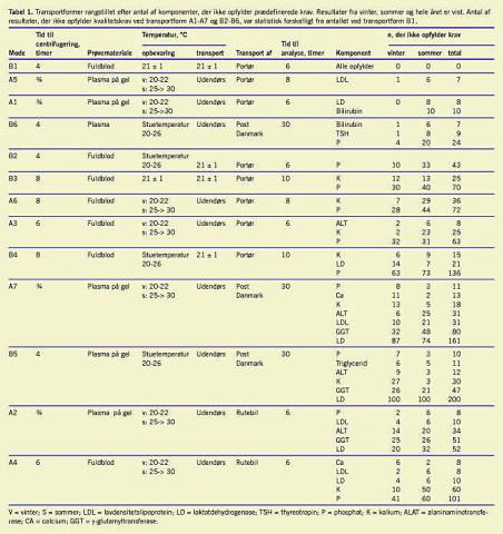 Tabel 1 viser rangordnet, hvilke transportformer der opfylder kvalitetskravene. De mest transport/opbevaringsfølsomme komponenter var kalium (K), phosphat (P), alaninaminotransferase (ALAT), γ-glutamyltransferase (GGT) og laktatdehydrogenase (LD), især hvis prøverne var udsat for høje temperaturer (A2, A7, B5).