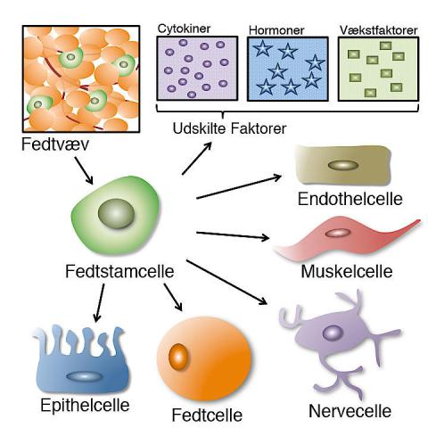 Fedtstamcellerne accelerer vævenes regenerering ved at frisætte hormoner, cytokiner og vækstfaktorer, men også ved at udvikle sig til nye terminalt differentierede celler som f.eks. hud-, endotel- og muskelceller (se figuren).