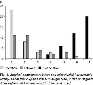 Indtil nu er der inkluderet 40 patienter i denne prospektive undersøgelse af staplet hæmorroidektomi. Den mediane operationstid var 30 min (15-60). Den præoperative undersøgelse viste grad 4-hæmorroidesygdom hos alle patienter, cirkumferentielt hos 24; sphinctertonus og -knibekraft var normal hos alle, ligeledes rektoskopien. Den mediane indlæggelsestid var én o vernatning (0-8). Den postoperative smertescore er vist i Fig. 3 , den mediane score varierede fra 3 de første dage til 1 dag fem, med nogen spredning, især inden for de første døgn. Fire patienter blev her genindlagt, fordi smertebehandlingen ikke var fulgt. Fig. 4 viser, at det hos majoriteten af patienterne er lykkedes at rekonstruere en nyt anus, idet anatomiscore var reduceret signifikant (p<0,05, χ2 -test). Ved efterkontrol var anatomiscore steget, men ikke signifikant (p>0,05, χ2 -test).