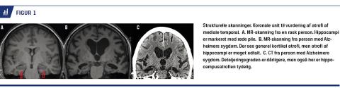 Alle personer, som undersøges for kognitiv dysfunktion, skal udredes med strukturel skanning. Det væsentligste formål med strukturel skanning i forbindelse med basal udredning er: 1) at udelukke andre, behandlelige årsager, f.eks. intrakranial tumor, blødninger (f.eks. subduralt hæmatom) eller hydrocefalus og 2) at afsløre eventuelle vaskulære læsioner (infarkter eller iskæmiske skader) som årsag til den kognitive dysfunktion. Det er også muligt – selv med CT – at påvise specifikke neurodegenerative forandringer (lokaliseret atrofi), der kan lede til diagnosen [2, 3]. Især kan atrofi af de mediale temporallapper understøtte diagnosen Alzheimers sygdom (AS). Denne atrofi kan bedst påvises på koronale snit (Figur 1). CT kan således anvendes som led i basal udredning, men MR-skanning giver ofte supplerende oplysninger. Sensitivitet og specificitet af kliniske diagnosekriterier for AS over for andre demenssygdomme på baggrund af ovenstående basale udredningsprogram er i en metaanalyse fundet at være hhv. 79% og 73%, når referencen er histopatologisk verificering af AS-patologi [4].