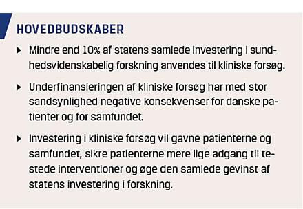 tilbydes de danske patienter. Det er derfor vigtigt at evaluere, om kliniske forsøg bliver prioriteret ligeværdigt med andre dele af fødekæden i sundhedsvidenskabelig forskning, som basal og translationel forskning.