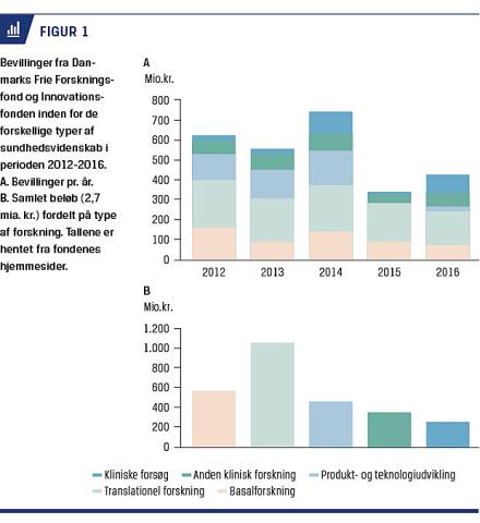 Vi har systematisk gennemgået alle bevillinger fra DFF og de store bevillinger (grand solutions) fra IF i femårsperioden 2012-2016. Ved at gennemgå projektbeskrivelserne, der er offentligt tilgængelige på DFF’s og IF’s hjemmesider, har vi kategoriseret forskningen som værende basal, translationel, produkt/teknologiudvikling, anden klinisk forskning eller kliniske forsøg. Den samlede årlige størrelse på bevillingerne fra DFF har vi valideret mod de årlige opgørelser fra DFF. IF publicerer ikke tilsvarende detaljeret statistik, og derfor har vi kun medtaget projekter fra grand solutions og »store bevillinger« fra Det Strategiske Forskningsråd frem til 2014, disse er også at finde under Grand Solutions på IF’s hjemmeside. Information om afslag samt tidligere års opslag er ligeledes hentet fra DFF og IF’s hjemmesider.