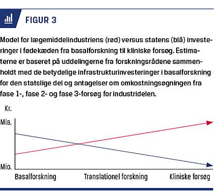 Den lave investering i det sidste led i forskningsfødekæden har formodentlig negative konsekvenser for patienterne og samfundet. Patienterne får ikke den bedste behandling og pleje, når det gælder både udviklingen af nye behandlinger og plejetiltag og evaluering af det, der allerede bliver anvendt. Samfundet får ikke den fulde gavn af investeringerne i basal og translationel forskning, når der ikke investeres i de forsøg, hvor man skal undersøge lovende fund og bringe viden ud til patienterne. At offentlige investeringer i kliniske forsøg er gavnlige, understøttes af de australske erfaringer med forsker- og netværksdrevne kliniske forsøg [4]. Et dansk eksempel, der understøtter dette, er 6S-forsøget blandt intensivpatienter med sepsis [6], som har resulteret i hundredvis af reddede patientliv og mindst 40 mio. kr. sparet for regionerne for en samlet offentlig investering på 8 mio. kr. [7]. Samlet ser det ud til, at der en ubalance i statens finansiering af sundhedsvidenskabelig forskning, hvor der paradoksalt anvendes færre midler, jo tættere forskningen kommer på patienterne (Figur 3). Når industrien skal være hovedsponsor for kliniske forsøg, vil forbedringerne i behandlingen komme på de områder, hvor der er kommerciel interesse, dvs. hvor en investering med rimelig sikkerhed betaler sig.