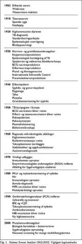 Den rivende biomedicinske udvikling har styret Statens Serum Instituts udvikling i hele perioden, således at Instituttet uafbrudt har været i stand til at løse presserende opgaver for det danske sundhedsvæsen i takt med ændringer i sygdomsmønstret og i mulighederne for forebyggelse, diagnostik og behandling (Fig. 1 ). Instituttet har især beskæftiget sig med udvikling og produktion af terapeutiske antisera, vacciner og blodprodukter, udvikling og udførelse af diagnostiske laboratorieundersøgelser med hertil hørende daglig rådgivning af landets læger, epidemiologiske undersøgelser, epidemibekæmpelse og en omfattende forskning.
